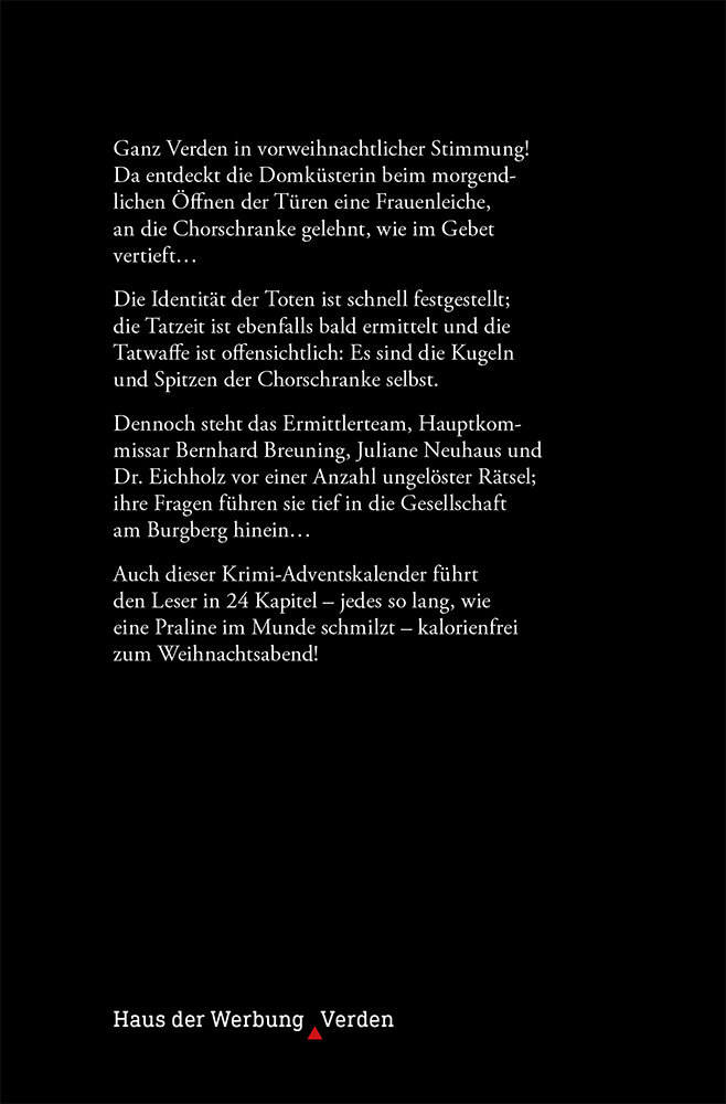 Ganz Verden in vorweihnachtlicher Stimmung! Da entdeckt die Domküsterin beim morgendlichen Öffnen der Türen eine Frauenleiche, an die Chorschranke gelehnt, wie im Gebet vertieft…